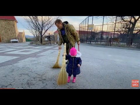 Ангелина помогает Человеку-льву ПОДМЕТАТЬ ВЕЧЕРОМ ТАЙГАН !