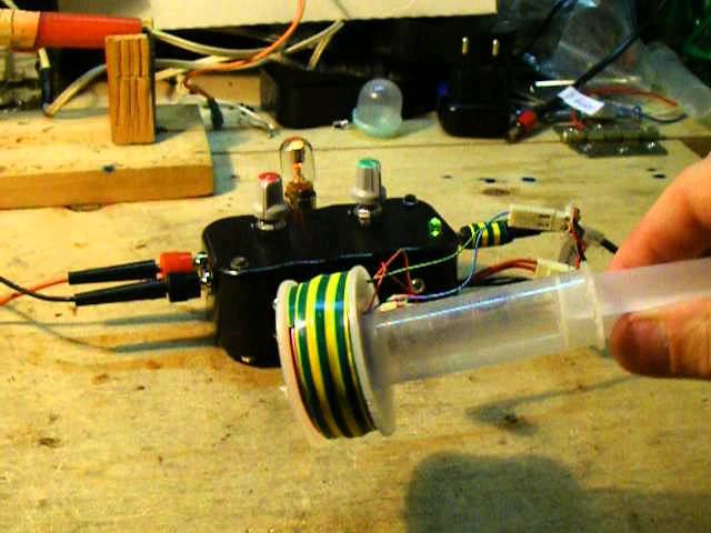 Начало опытов здесь: http://www.youtube.com/watch?v=PlcHZ7n6AqQ и здесь: http://www.youtube.com/watch?v=FcV94PNfS3s Раскрутка до огромной скорости неодимового магнита в виде шара при помощи устройства Бедини. Схема та же самая, что и всегда: http://siliks.org/STUFF/freeenergy/cooler_bedini_work.gif Напряжение питания - 12 вольт. Транзисторный коммутатор по Бедини сделал в отдельной коробочке. Обмотки катушки намотаны проводом от кроссировки (такой же, как компьютерная "витая пара", но потоньше) на плоской катушке от припоя, в два провода, до заполнения катушки. В катушку плотно входит шприц на 20 кубиков. Поршень шприца регулирует расстояние от шарика до катушки. Скорость вращения шарика судя по воющему звуку - очень и очень высокая. Неодимовый магнит в виде шара брал здесь: http://magnet-prof.ru/index.php/Drugie-formyi-NdFeB/Magnitnyiy-sharik-D15mm/flypage.tpl.html