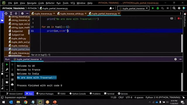 In this session i have covered the following topics: Tuple Traversal: Traverse the tuple using for loop Traversal using range() Partial Traversal using slicing operator Iterate specific section of the tuple Reverse the tuple Iterate in the reverse order Traversal using positive index number Traversal using negative index number Tuple operations: Concatenation Repetition / replicate Membership: ( in , not in ) Slicing #pythonforbeginners #pythontutorialday15 #code #codeforbeginners #codewithsubbu #tuple #tupletraversal #tupleoperations #devopstutorial #codeforme #python #english