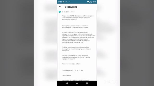 Видео отчёт. Наконец, после 21!!!! обращения по кругу в эти же инстанции - металлическое ограждение установлено ( забор). К сожалению это ужасная практика и не уважение к жителям города Красногорска от администрации города Красногорска и министерства транспорта. Мои обращения были , как и всегда: 1) сайт Добродел 2) правительство Московской области 3) министерство благоустройства 4) министерство транспорта 5) главное контрольное управление Московской области 6) ГУСТ МО 7) прокуратура И первые два ответа с каждой инстанции - были вопрос решён и только ГУСТ МО умудрился написать в ответе - частично, дабы обезопасить себя. Волков не справляется со своими должностными обязанностями! По моему субъективному мнению необходимо увольнять всех сотрудников, кто изначально подписал ответ, что не соответствует действительности. P.S. мне многие знакомые говорят до сих пор - зачем тебе это надо. Но наша жизнь тут и сейчас и состоит из всего этого. Если вы пройдете мимо этих нарушений закона, спустите на тормозах - этот обман, то по какой причине в другой сфере жизни вы ждёте что-то хорошее ? Ведь те же сотрудники из другой сферы скажут - ну там же прокатило. Я сколько раз писала про отсутствие туалетной бумаги в поликлинике пор КГБ 1. Мне аналогично люди много, что писали в ответ, а ответ от Минздрава- должна быть! Но по закону она должна там быть - и о чудо - мы несколько раз пришли туда в этом году и она была. Осталось выяснить на счёт мыла и одноразовых полотенец. Онкополиклинику благодаря мне все же перенесли с улицы Ткацкая фабрика в поликлинику КГБ 1. Ушло на это почти год. Но и поликлинику на Ткацкой фабрике оштрафовали за нарушение только спустя три!!!! Моих обращения в Минздрав. Первые два были просто отписка. Но это произошло! К сожалению сейчас есть такой момент - все сотрудники смотрят - "прокатит" или "сойдёт" такой ответ и вы замолчите. Если вы не молчите, то проверка приходит. Для тех, кто не в курсе - Онкополиклиника выдала направление в онко Моники (сейчас точно не вспомню, но ждать 1,5 месяца вроде необходимо было, а по закону - не более 14 дней). Так мне умудрилась позвонить на мой личный телефон заведующая и орать , что вообще не понимает зачем доктор выдал туда направление. Я сказала - напишите отказ документально - что вы против, вы выше обычного врача, в чем проблема. И что вы думаете - ни один из врачей такое не подпишет. На сколько я знаю, на данный момент в поликлинике КГБ 1 не она заведующая. А врач, что принимал нас в Онкополиклинике в городе Красногорске сейчас оперирующий хирург в Моники. Терапевт в поликлинике при КГБ 1 аналогично не работает больше там, кто отказался выдать направление к онкологу. Нам пришлось идти сложным путем - прийти в КВД - завести карту, записаться к врачу, ждать две недели приема. А на приёме врач очень был удивлен, что нам не выдали направление - он его сразу написал и мы пошли в онко поликлинику заводить карту и записываться. Если у вас что-то серьезное, то на этом этапе теряется месяц. Систему можно и необходимо менять в лучшую сторону - а это значит спрашивать работу с каждого органа местного самоуправления и власти. Писать во все инстанции, не молчать. Да, придется не в интернете смотреть какой-то ролик, а потратить немного своего времени на написание текста - зато потом копировать и вставить и конечно приложить доказательства. Же