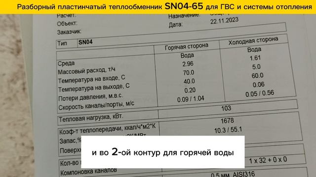 Для ГВС - https://www.ozon.ru/product/plastinchatyy-teploobmennik-sn04-50-dlya-gvs-140-kvt-2510-l-chas-1268384234/ Для отопления - https://www.ozon.ru/product/plastinchatyy-razbornyy-teploobmennik-sn04-50-dlya-otopleniya-ploshchadi-600-m2-moshchnost-60-kvt-1269568129/ Пластинчатый разборный теплообменник SN04-65 для работы в системах отопления и ГВС. Аппарат для применения в системе отопления обладает следующими характеристиками: 1. Тепловая нагрузка 103 кВт 2. Горячая сторона. Вход: 70С, Выход: 40С 3. Холодная сторона (отопление внутр.) Вход: 5С, Выход: 60С Массовый расход 1,61 т./ч. 4. Патрубки: Ду32 , нар.резьба 5. Поверхность теплообмена (2,65м2) - 65 пластин Аппарат для применения в системе ГВС обладает следующими характеристиками: 1. Тепловая нагрузка 143 кВт 2. Горячая сторона. Вход: 80С, Выход: 60С 3. Холодная сторона (вода) Вход: 40С, Выход: 70С Массовый расход 4,11 т./ч. 4. Патрубки: Ду32 , нар.резьба 5. Поверхность теплообмена (2,65м2) - 65 пластин 6. Предназначен для 9-ти точек непрерывного водоразбора ГВС. ✅ Пластины теплообменника изготовлены из нерж. стали - AISI316 ✅ Высокие рабочие характеристики: макс. рабочее давление - 16 бар., макс. рабочая температура - 150С. ✅ Гарантия 3 Года ✅ Разборная конструкция позволяет легко промывать и обслуживать теплообменник. Мы производим пластинчатые теплообменники с 2009 года, поэтому можем предложить вам лучшие условия: ? - Предложим цену на 30% ниже рынка! ??️ - Изготовим ваш теплообменник за 1 день! ? - Надежно упакуем и доставим оборудование на ваш объект! ?? - Доставим теплообменник в любую точку России! ? - Расчет теплообменников ведется в сертифицированной программе расчета. Подберем на любую мощность и посчитаем за 15 минут! ? - Постоянная сервисная поддержка!