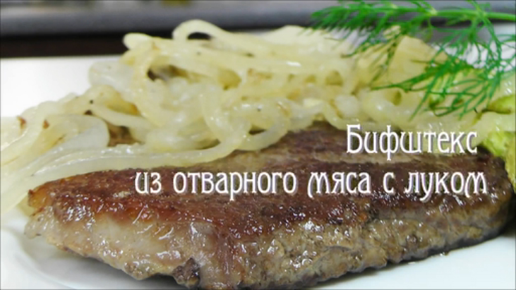 Рецепт приготовления диетического блюда из говядины с луком Приготовлено по рецепту из "Книга о вкусной и здоровой пище": БИФШТЕКС ИЗ ОТВАРНОГО МЯСА С ЛУКОМ Мясо очистить от сухожилий и частично от жира, слегка отбить тяпкой и придать ему форму блина. Дно кастрюли смазать маслом, положить мясо, до половины залить его водой, закрыть крышкой и кипятить 5-7 минут, после чего вынуть мясо, дать ему слегка обсохнуть и обжарить на масле с обеих сторон. Очищенный лук нарезать кружочками, разобрать на кольца, сварить в воде до пол у готовности, откинуть на сито и дать обсохнуть, а затем обжарить на масле, засыпать бифштекс жареным луком и подавать. На гарнир дать жареный картофель или кабачки, тыкву, капусту белокочанную или цветную, салат.