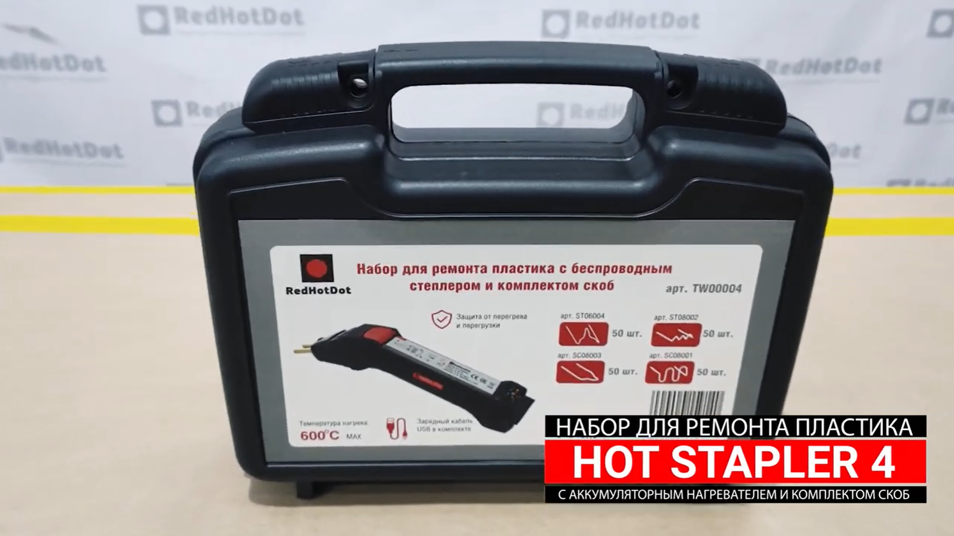 Горячий степлер RedHotDot с аккумуляторным нагревателем и комплектом скоб в комплекте. В современном автомобиле много деталей из различного вида пластмассы, чаще всего ремонтируют самые дорогостоящие из них: бамперы, корпуса фар. Аккумуляторный нагреватель RHD Hot Stapler 4 позволяет отремонтировать даже сильно поврежденные элементы, в том числе воспринимающие значительные механические нагрузки. Соединение фрагментов происходит путем вплавления в пластик специальных скоб из нержавеющей стали. Скобы изготавливаются различной формы для простых и фасонных соединений. Всего за несколько секунд можно получить прочное и эластичное соединение.