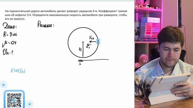 На горизонтальной дороге автомобиль делает разворот радиусом 9 м. Коэффициент трения шин об - №40049