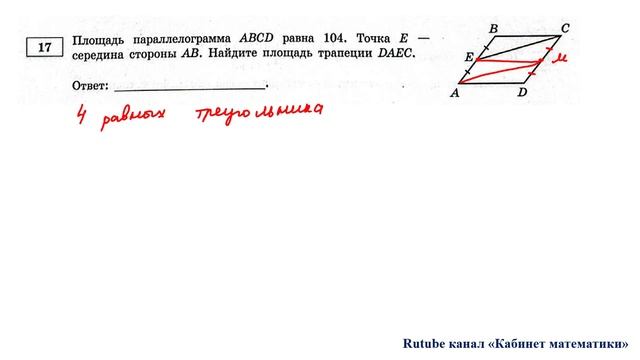 Задание 17. Площадь параллелограмма ABCD равна 104. Точка Е - середина стороны АВ. Найдите площадь трапеции DAEC. Курсы для подготовки к ОГЭ и ЕГЭ по математике: https://stepik.org/users/608571559/teach Группа ВК для подготовки к ОГЭ: https://vk.com/secretroom2023 Подготовка к ОГЭ по математике