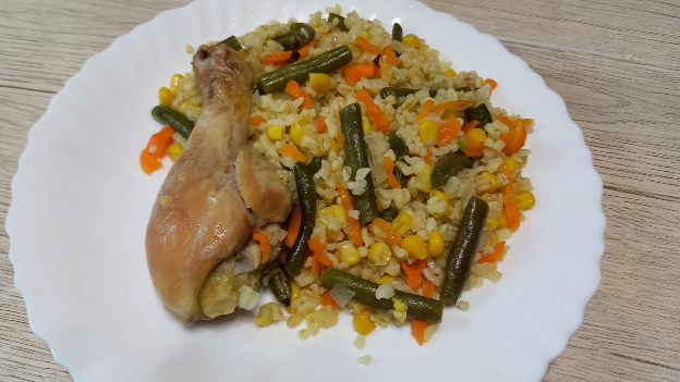 рецепт булгур 250 г лук репчатый 1/2 шт. морковь 1 шт. фасоль стручковая 150 г кукуруза консервированная 150 г соль по вкусу голень куриная 6 шт. масло растительное 3 ст.л. вода (кипяток) 700 г #обед #ужин #просто #вкусно #кулинария #что приготовить #какприготовитьбулгур