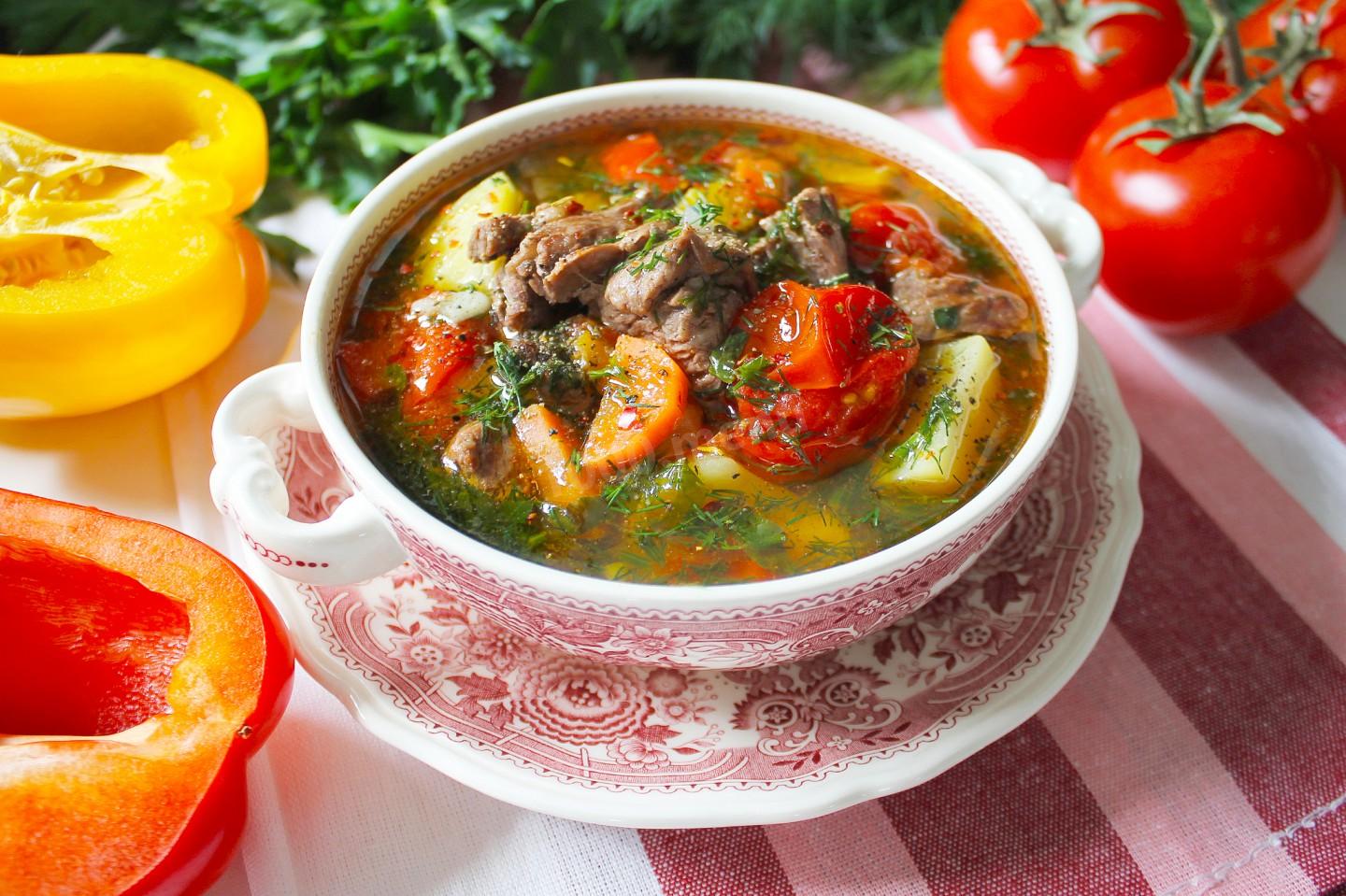 ШУЛЮМ ИЗ ГОВЯДИНЫ с копчёными рёбрышками Ингредиенты: Говядина 800 гр Растительное масло Копченые ребрышки 400 гр Картошка 700 гр Лук (среднего размера) 2 шт. Морковь 2 шт. Болгарский перец 2 шт. Помидоры 500 гр Чеснок по вкусу Лавровый лист по вкусу Соль по кусу Перец по вкусу Зелень по вкусу Вода 3 литра
