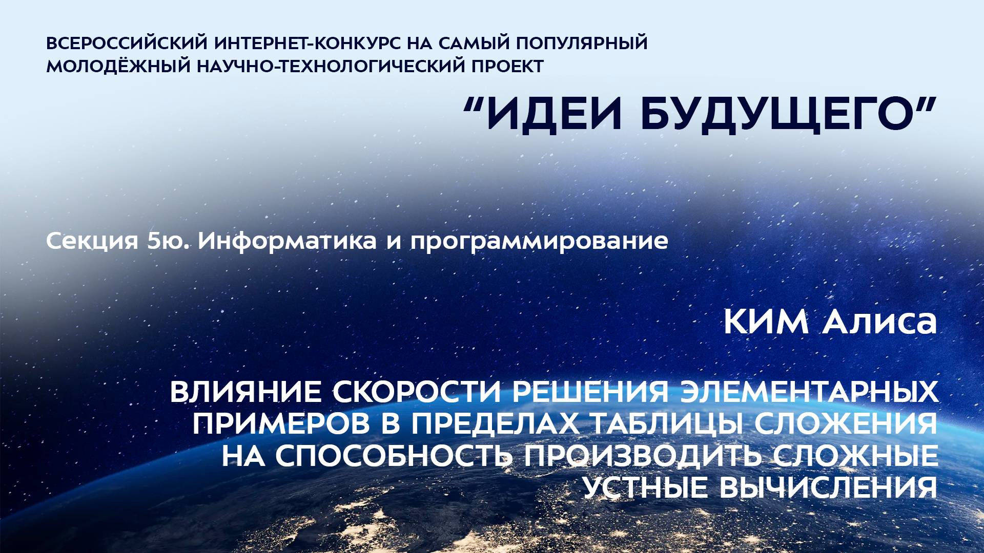 (5Ю-13) КИМ Алиса Евгеньевна Московская область, г. Королев МБОУ СОШ № 3, 5 класс ВЛИЯНИЕ СКОРОСТИ РЕШЕНИЯ ЭЛЕМЕНТАРНЫХ ПРИМЕРОВ В ПРЕДЕЛАХ ТАБЛИЦЫ СЛОЖЕНИЯ НА СПОСОБНОСТЬ ПРОИЗВОДИТЬ СЛОЖНЫЕ УСТНЫЕ ВЫЧИСЛЕНИЯ Научный руководитель: Барковская Яна Сергеевна, Московская область, г. Королев, МБОУ СОШ №3, учитель начальных классов, заместитель директора по УВР Более подробно о мероприятиях Программы "Шаг в будущее" можно узнать на сайтах http://www.step-into-the-future.ru/ и http://шагвбудущее.рф