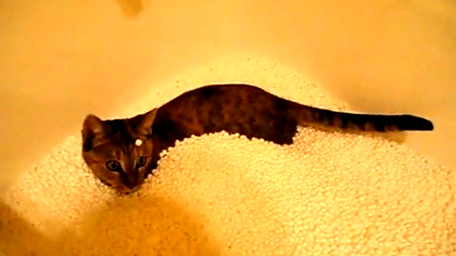 Кошка плавает в пенопласте