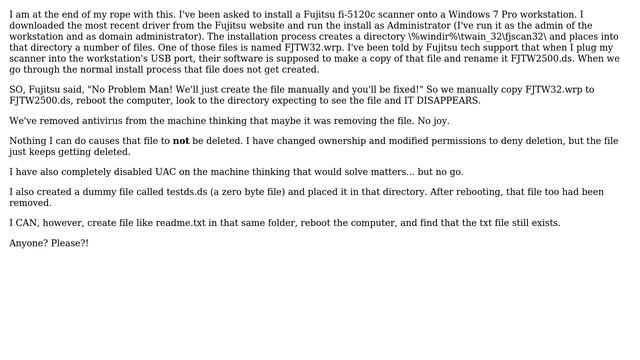 Windows 7 Automatically deletes necessary scanner file from %windir%twain_32fjscan32 directory