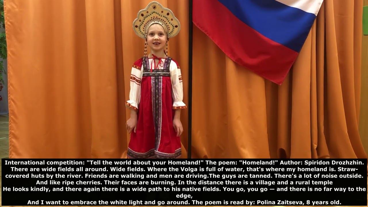 Международный конкурс «Расскажи миру о своей Родине» — проект по патриотическому воспитанию детей и молодёжи и формированию дружественных международных связей между подрастающими поколениями разных стран. «Меня зовут Полина, мне 8 лет. Я люблю Россию, больше всего мне нравится природа, я люблю путешествовать по российским городам и узнавать много нового об окружающем мире. Стихотворение о Родине мы подобрали совместно с педагогами и мамой».