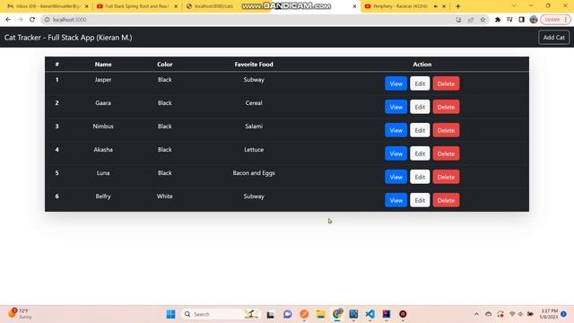 Super excited about this! My first "Full stack" app, felt great finally being able to put all the pieces together and create a front and back end. Got the front-end started with the help of code with Arjun's YouTube video then decided to finish the remaining 75% with what I learned! Super fun. Took about 1-2 days. Bootstrap is a life/time-saver as well. Forgot to return to the database at the end of the video but obviously, all these CRUD operations on the UI are being sent to the backend and updated in MySQL. All the code for the front and back is shown in the video if anybody wants to replicate or build upon, just pause on each screen.