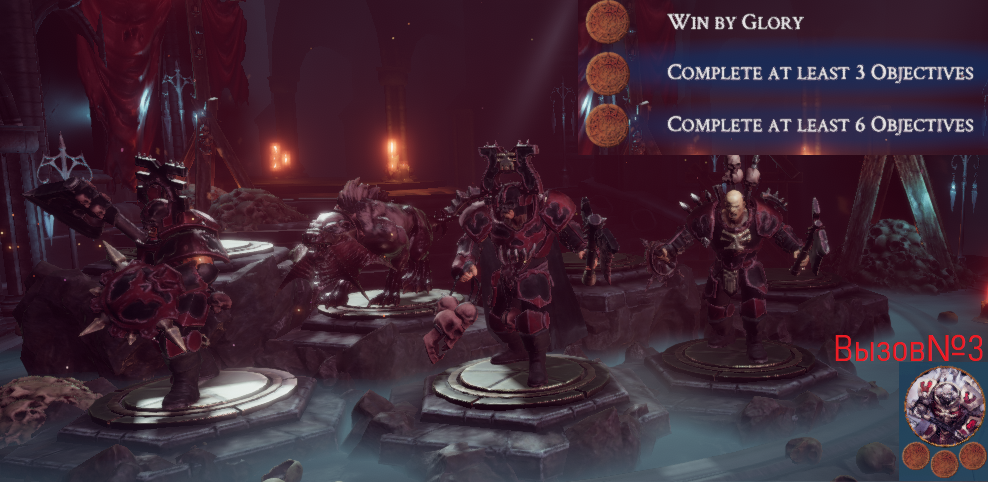 В Warhammer Underworlds Online имеется режим вызовы, где можно получить расцветку на банду и портрет для профиля игрока. Прохождение вызовов для банды "Изверги Магора" Условия победы всех вызовов на максимальный результат одинаковы: 1) Победить (Набрать больше жетонов славы чем у противника) 2) Выполнить 3 из 9 карт целей. 3) Выполнить 6 из 9 карт целей. Прохождения третьего вызова, на максимальный результат.