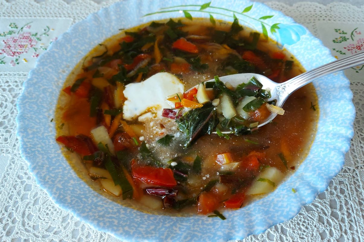 Летний овощной суп со свекольными листьями.