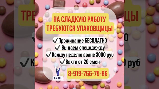 ☑️На шоколадную фабрику в г. Ступино, в связи с увеличением производства открыт дополнительный набор упаковщиц, фасовщиц 📌Работа, не требующая навыков: 📌снимать готовую продукцию (шоколадные яйца, различные шоколадные фигурки) с конвейерной линии 📌складывать готовые шоколадные изделия в коробки 📌визуально осматривать шоколадное изделие на наличие браков. Все условия можете узнать в ОТДЕЛЕ КАДРОВ👇🏻👇🏻👇🏻 ☎️ 89197667586 (WhatsApp, Viber) http://wa.me/79197667586 ☎️ 89771289232 (WhatsApp, Viber) http://wa.me/79771289232 Наш Телеграмм канал с видео о работе и отзывами сотрудников: 👉🏻 РАБОТА.ВАХТА.АБСОЛЮТ 👉🏻 🤳🏽 https://t.me/vahta_ok Страничка ВК: https://vk.com/rabota_vahta_absolut Страничка в ОК: https://ok.ru/profile/579701607021?utm_campaign=ios_share&utm_content= #тольятти #ульяновск #нижнийновгород #челябинск #краснодар #кемерово #новокузнецк #альметьевск #липецк #тверь #иваново #нижнийтагил #курган #армавир #абакан #майкоп #калуга #смоленск #таганрог #златоуст #копейск #железногорск #ростов #елец #крым #нижнекамск #орск #арзамас #саранск