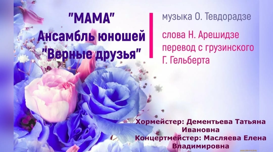"Мама" муз. О.Тевдорадзе, сл.Н. Арешидзе исп. ансамбль юношей "Верные друзья" хормейстер Т.И. Дементьева, концертмейстер Е. В. Масляева #верныедрузьяансамбльюношейтатьянадементьева #алыйпарусддкпичугина #маматевдорадзеддкпичугина #деньматериновосибирскддкпичугина ДДК им. Д.Н.Пичугина всегда открыт для Ваших талантливых детей и новых проектов! https://ddk-pichugina.ru/ ул. Богдана Хмельницкого, 70/1 Администрация. Детская хоровая студия «Дружба». Группы интеллектуального развития детей (ГИДы) Филиалы: ДДК им. Д. Н. Пичугина ул.А.Невского,45 Студия ОРНИ, Студия Хореографии «Вдохновение», Групповые занятия для детей с ОВЗ ДДК им. Д.Н.Пичугина ул.Б. Хмельницкого,64 Студия прикладного, изобразительного и технического творчества