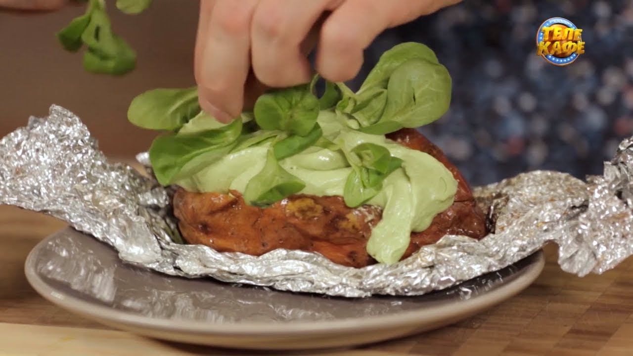 Вегетарианский рецепт из сладкого картофеля. Ингредиенты: батат, авокадо, сыр сливочный, салат корн, чеснок, соль, лимонный сок