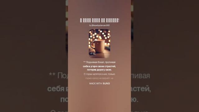 Автор слов текста песни Дюкова Татьяна. Использовать можно только с разрешения. АРАНЖИРОВКА ПЕСНИ и текста СДЕЛАНА С ПОМОЩЬЮ НЕЙРОСЕТИ. Нейросеть делает разные аранжировки на текст песен, используя свой алгоритм и музыкальную базу данных, поэтому каждая новая версия звучит как уникальное произведение. И песни получают каждый раз новое вдохновение и выходят в совершенно новом свете. Поэтому часто выкладываю вам из десяти песен написанных на один текст – несколько - выбирайте сами, что вам по душе И СЛУШАЙТЕ