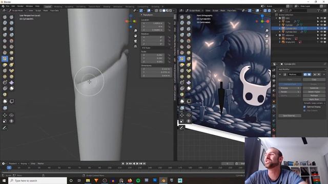 In this video I'll model, sculpt, rig and quickly render the Hollow Knight character in Blender. This was a livestream event, so everything happens in real time with a bit of QnA spaced throughout the video. There is also a timelapse version of this video for anyone who can't sit through the 2.5 hours livestream. It has some additional video at the end where I rework some things and complete a final render: https://youtu.be/YESQgLh5L10 0:00 Introduction - Character references 5:00 Modelling the body 8:30 Modelling the legs 12:05 Modelling the arms 13:31 Attaching the arms to the body 19:05 Attaching the legs to the body 26:45 Modelling the skull 30:28 What kind of drawing tablet should you get? 53:50 Modelling the sword/nail 1:00:00 Sculpting the cracks in the sword/nail 1:09:00 Dragonboots tutorial courses and products 1:11:30 Adding basic materials 1:15:40 Rigging with Rigify 1:22:35 Posing the character 1:32:50 Modelling the cloak 1:43:25 Sculpting the cloak with Dyntopo 1:52:10 Lighting, fog, god rays and rendering 1:59:55 Adding glowies 2:07:05 Final thoughts and final render
