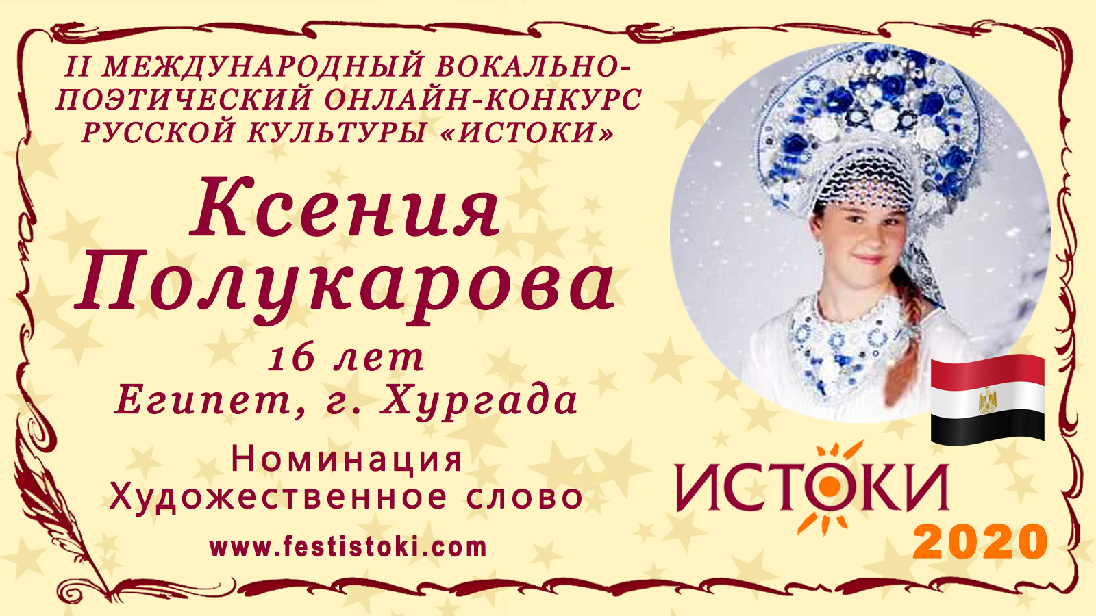 Лауреат II степени II Международного вокально-поэтического онлайн-конкурса русской культуры «Истоки». Номинация - Художественное слово. Стихотворение "Мелколесье. Степь и дали…". Автор С. А. Есенин. Сайт: www.festistoki.ru / www.festistoki.com E-mail: festistoki@mail.ru