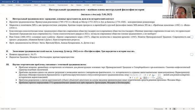Сообщение И.А.Жубрина об интегральном традиционализме в рамках работы лаборатории философии истории Института интегральной науки (05.06.25).