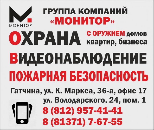 Группа компаний "Монитор": охрана домов, квартир, бизнеса в Гатчине и районе. Пожарная безопасность, системы видеонаблюдения, ГЛОНАСС-мониторинг. Группа компаний "Монитор" осуществляет свою деятельность с 2000 года! Мы работаем для Вашей безопасности! ОХРАННОЕ ПРЕДПРИЯТИЕ "МОНИТОР" - единственное в Гатчинском районе охранное предприятие ВООРУЖЕННОЕ ОГНЕСТРЕЛЬНЫМ ОРУЖИЕМ! - группы быстрого реагирования ведут круглосуточное патрулирование в г. Гатчина и в Гатчинском районе! - пультовая охрана объектов (радиоохрана)! - установка тревожных кнопок! Ленинградская обл., г. Гатчина, ул. Карла Маркса, д. 36-а, офис 17 Тел.: 8 (812) 957-41-41 Полный спектр услуг в области ПОЖАРНОЙ БЕЗОПАСНОСТИ: - разработка декларации пожарной безопасности; - определение категорий пожарной опасности; - разработка раздела ИТМ ГО и ЧС проектной документации; - разработка 9-го раздела проектной документации; - разработка и изготовление фотолюминесцентных планов эвакуации; - проект, монтаж и наладка автоматических систем пожаротушения, охранно-пожарной сигнализации и системы оповещения; - техническое обслуживание охранно-пожарной сигнализации, систем оповещения и пожаротушения; - огнезащитная обработка. Ленинградская обл., г. Гатчина, ул. Володарского, д. 24, пом.1 Ленинградская обл., г. Гатчина, ул. Урицкого, д. 19 (вход со двора) Тел.: 8 (81371) 76-755 Продажа и установка всех видов СИСТЕМ ВИДЕОНАБЛЮДЕНИЯ: Ленинградская обл., г. Гатчина, ул. Володарского, д. 24, пом.1 Тел.: 8 (81371) 76-755 Тел.: 8 (911) 233-30-33 GPS/ГЛОНАСС-мониторинг: С помощью систем GPS/ГЛОНАСС-мониторинга транспорта можно наблюдать за движением автомобилей, контролировать время работы водителей, следить за расходом топлива, видеть маршруты за любой промежуток времени. Тел.: 8 (81371)76-755 Магазин "СПУТНИК-М" Здесь Вы можете приобрести: - системы спутникового телевидения, - оружейные шкафы, сейфы, - противопожарное оборудование, - стальные двери, - радиоуправляемые модели. Ленинградская обл., г. Гатчина, ул. Рощинская, д. 1-а. Тел.: 8 (911) 922-15-51 Часы работы: вт-пт с 10:00 до 18:00, сб с 10:00 до 16:00, вс-пн - выходной (обеденный перерыв с 13:00 до 14:00) Сайт: monitor.gatchina.ru/ Сайт: www.мониторр.рф ВКонтакте: vk.com/monitor_gatchina В Интернете (в поисковиках) нас находят, в частности, по таким словам: охранное предприятие Гатчина, охрана домов Гатчина, охрана квартир Гатчина, охрана бизнеса Гатчина, пожарная безопасность Гатчина, системы видеонаблюдения Гатчина. #охранноепредприятие #Гатчина #охранадомов #Гатчинскийрайон #Ленинградскаяобласть #охранаквартир #системывидеонаблюдения