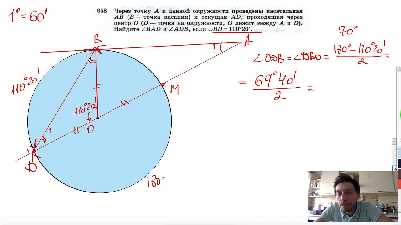 №658. Через точку А к данной окружности проведены касательная АВ (В — точка касания) и секущая AD, проходящая через центр О (D — точка на окружности, О лежит между А и D). Найдите ∠BAD и ∠ADB, если ∪BD = 110°20'. Поддержать канал рублём - 5469400944002125 (Сбербанк) Мой второй канал для подготовки к ЕГЭ и ОГЭ - https://www.youtube.com/ЕвгенийСумин Инстаграм - https://www.instagram.com/EGE_OGE.math Личный инстаграм - https://www.instagram.com/ee_sumin VK - https://vk.com/evgeniysumin FB - https://www.facebook.com/EvgeniySumin