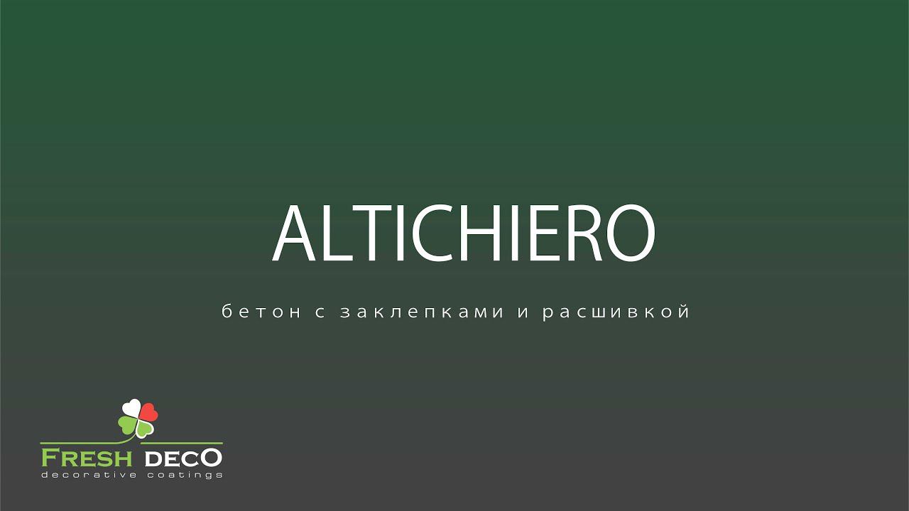 Altichiero - декоративный материал с наполнителем из мраморного песка и акриловых связующих. Материал обладает высокой пластичностью, что позволяет использовать его в различных техниках нанесения. Бетон с заклепками и расшивкой 1. Нанесите с помощью валика грунт Quarzo fondo. Дайте поверхности высохнуть. 2. Через 2-4 часов нанесите венецианской кельмой материал Altichiero на сдир, сразу же поднимите шубку материала фактурным валиком. 3. Через 4-6 часов нанесите второй слой материала Altichiero, приглаживая поверхность и оставляя небольшие островки первого слоя. 4. При нанесении второго слоя необходимо намечать расшивку, при этом постоянно обновляя край нанесенного материала. 5. Как только материал начнет подсыхать пригладьте поверхность пластиковой кельмой разнонаправленными движениями. 6. После полного высыхания, с помощью трафарета перенесите на поверхность заклепки. 7. При необходимости край заклепок можно обработать шлифовальной бумагой. 8. После высыхания всех деталей можно нанести на поверхность лессирующее покрытие Lasure с помощью валика или лак Silk Road, разбавленный водой 1:1 Фасовка материала: 7кг (в среднем 9кВ.м) и 15кг (в среднем 19кВ.м) Расход: 900 -1500гр/кВ.м., расход может меняться от способа нанесения