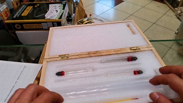 Набор спиртомеров с термометром и мерным пластиковым цилиндром в деревянной коробке представляет собой комплект из пяти приборов: спиртометров АСП-3 0-40,40-70,70-100, термометра и пластикового цилиндра объёмом 100 мл, которые используются для измерения содержания этилового спирта в жидкостях и контроля температуры измеряемой жидкости в процессе производства алкогольных напитков. https://alkodar.ru/products/nabor-spirtomerov-s-termometrom-i-mernym-tsilindrom-derevo