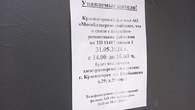 Всем добрый вечер. Помимо того, что необходимо ловить в течение нескольких дней сотрудников Мособлгаз, так ещё и завтра будет отключение электричества. Надеюсь все же только на два часа. Рекомендую вам отключить все свои приборы из розетки. Всем хорошего вечера. #2024 #россия #красногорск #город #дом