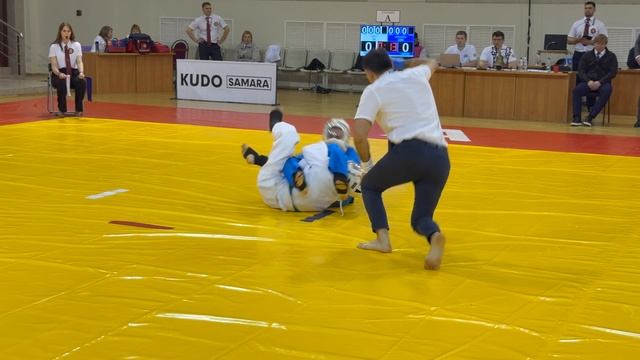 26.04.2025 в Самаре прошли Всероссийские соревнования по кудо «Кубок Поволжья». Бой в категории до 230 ед. 16-17 лет. В синем Елисей Чирков (Ярославская обл.), в белом Ярослав Большаков (Респ. Татарстан).