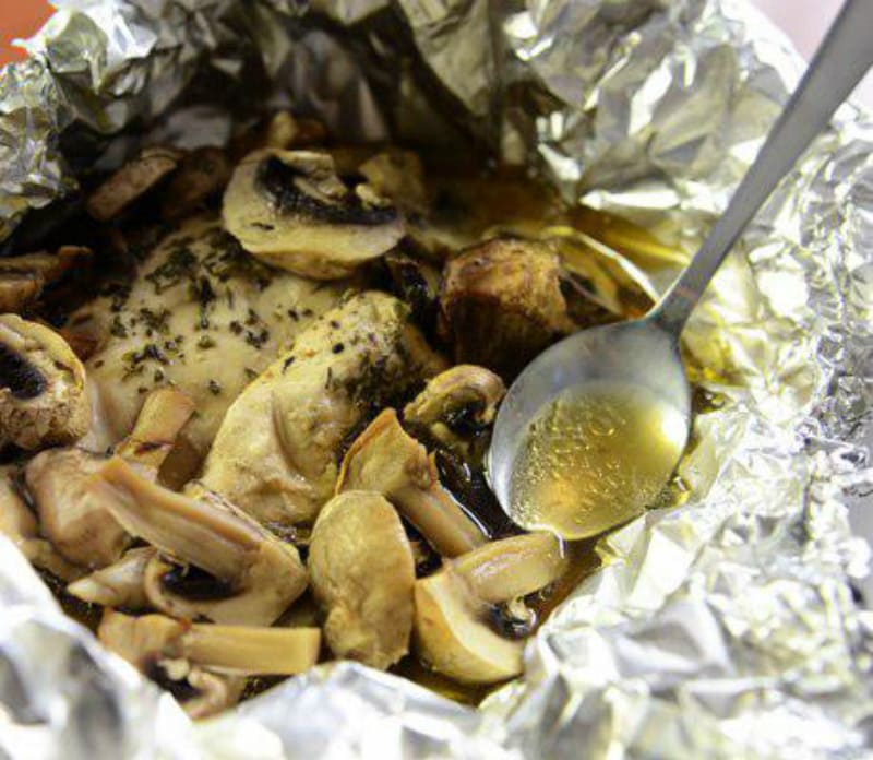 Индейка с грибами ИНГРЕДИЕНТЫ: Индейка (грудка) 1000 гр Грибы (шампиньоны) 400 гр Мускатный орех (натереть на тёрке) по вкусу Тимьян по вкусу Соль по вкусу Перец по вкусу Белое вино по вкусу Оливковое масло Нарежьте шампиньоны и филе индейки. Положите ингредиенты в фольгу, добавьте оливковое масло, белое вино, мускатный орех, веточку тимьяна, соль и перец. Сверните края фольги и готовьте в духовке в течение 30 минут при температуре 180 градусов