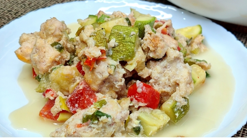 Запеканка из кабачков, курицы, помидор и сыра.