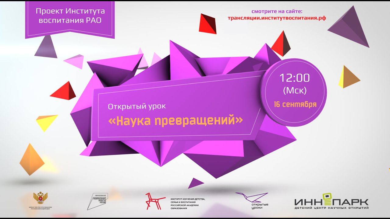 Всероссийский открытый урок «Наука превращений» Урок посвящён созданию Русского химического общества, основанному по инициативе Д. И. Менделеева около 150 лет назад. Трансляция ведется из детского центра научных открытий «ИнноПарк». В ходе урока школьники узнают: ✔ чем отличается химическая реакция от физической; ✔ почему не существует косметики без химических добавок; ✔ какой элемент таблицы Менделеева живёт меньше секунды. Гостями этого эфира станут: • Юлия Горбунова – доктор химических наук, профессор РАН, вице-президент Российского физико-химического общества. • Глеб Алёшин – кандидат химических наук, пятикратный лауреат Премии Правительства Москвы в области образования, сооснователь Межрегионального химического турнира. • Александр Кравченко – юный химик, самый молодой программист России, участник программ «Лучше всех» и «Золото нации». #институтвоспитания #открытыеурокирф