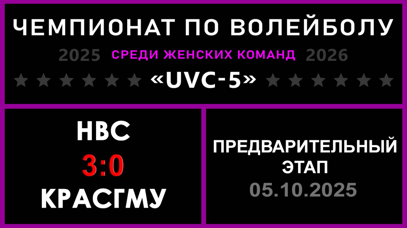 UVC-5 (Девушки): Чемпионат UVC Лиги по волейболу среди женских команд 2025-2026 гг. Результаты игры: Предварительный этап 06.10.2025 НВС - КрасГМУ 3:0 (25:22, 25:16, 25:23) Уверенная победа НВС над молодым КрасГМУ, но надо отметить, что игра прошла в борьбе! НВС показал более зрелую игру, чем весной, есть индивидуальный прогресс у игроков! У обновленной команды врачей очень хорошие перспективы, с тренировками и играми КрасГМУ будет прибавлять! ✅ НВС прошли в следующий этап конкурса «РЕШАЛЫ»! ⛔ КрасГМУ завершили своё участие в конкурсе «РЕШАЛЫ» на первом этапе! ✅ Точный исход матча угадали 3 участника «Nostradamus trophy»! #UVC_ЛИГА_ЧЕМПИОНАТ_UVC_5_Девушки