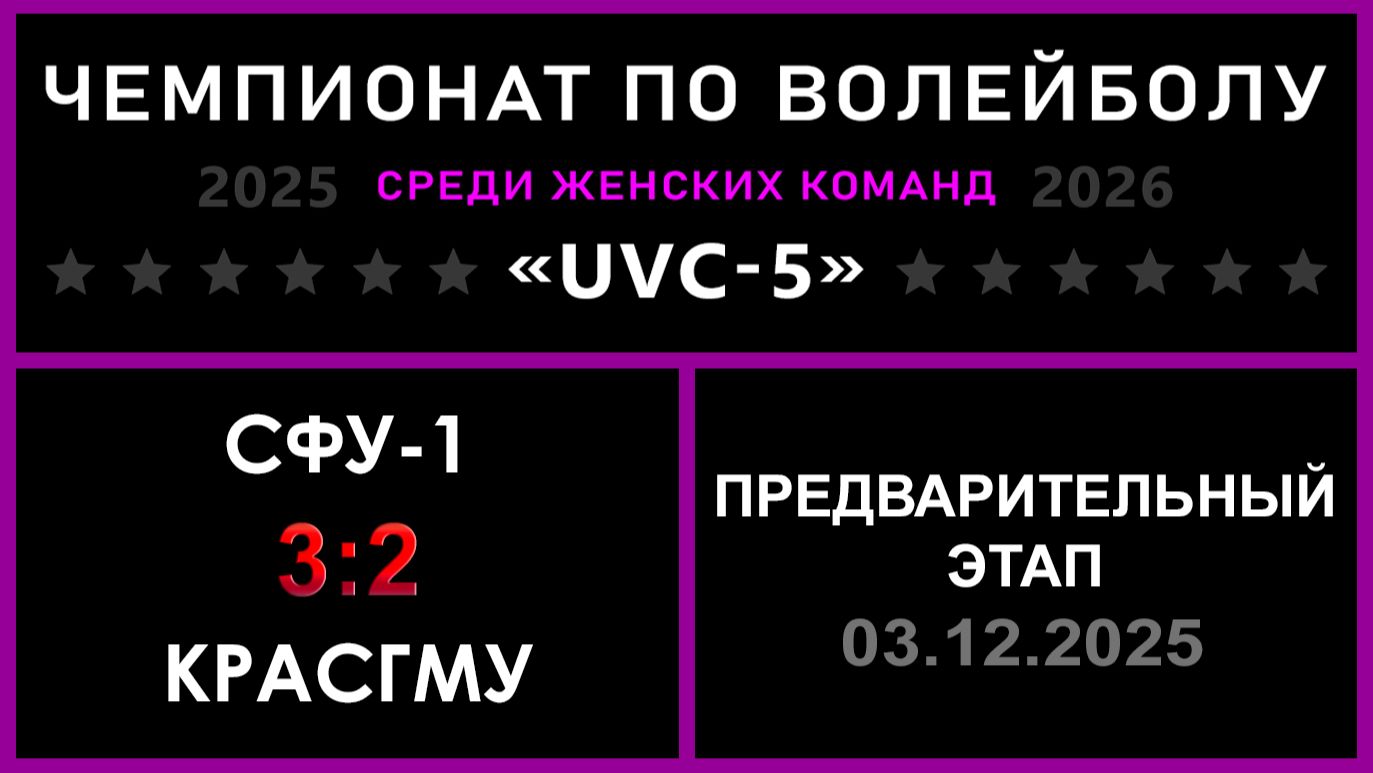 UVC-5 (Девушки): Чемпионат UVC Лиги по волейболу среди женских команд 2025-2026 гг. Результаты игры: Предварительный этап 03.12.2025 СФУ-1 - КрасГМУ 3:2 (18:25, 25:16, 25:22, 19:25, 15:13) «РЕШАЛЫ» - конкурс для команд : ✅ СФУ-1 идет дальше! «Nostradamus trophy» - конкурс для участников группы ВКонтакте: ✅ 2 - количество участников, которые смогли предсказать точный исход матча! #UVC_ЛИГА_ЧЕМПИОНАТ_UVC_5_Девушки