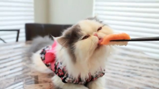 Кошка в кимоно ест суши