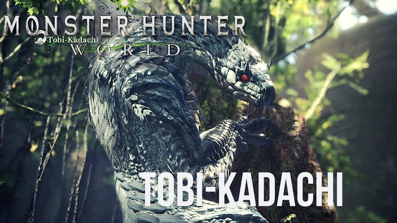 Tobi-Kadachi is a Fanged Wyvern first introduced in Monster Hunter: World. This monster flies among the trees of the Ancient Forest. Its penchant to brush against the ground and the trees as it moves around builds up static electricity within its fur. Tobi-Kadachi's face resembles a colubrid in appearance with grayish blue scales covering its slim squirrel-like shape. On its back are patches of white fur as well as a bushy tail covered in rows of spikes. Its front limbs also have a few spikes. Tobi-Kadachi's head, claws, back and tail can be wounded. When the monster is fully charged the fur on its back will stand up. As Tobi-Kadachi fights, it picks up static electricity in its fur by brushing against trees and the ground. Tobi-Kadachi uses this static electricity to increase the strength of its attacks. Master-Rank Tobi-Kadachi can charge up at will, and has a second charged state it can also achieve. Like a flying squirrel, Tobi-Kadachi has a membrane between its limbs that allow it to glide for long distances. In Master Rank, Tobi-Kadachi gains the ability to overcharge themselves if they are allowed to cling on a wall surface for an extended period of time. Their whole body will glow silvery in this state and their thunder element power becomes extremely potent, although they also get considerable reduce in movement speed. Part-breaking their tail can disable this ability entirely.