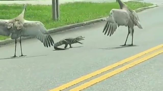 Как журавли прогоняют маленького аллигатора со своей территории.