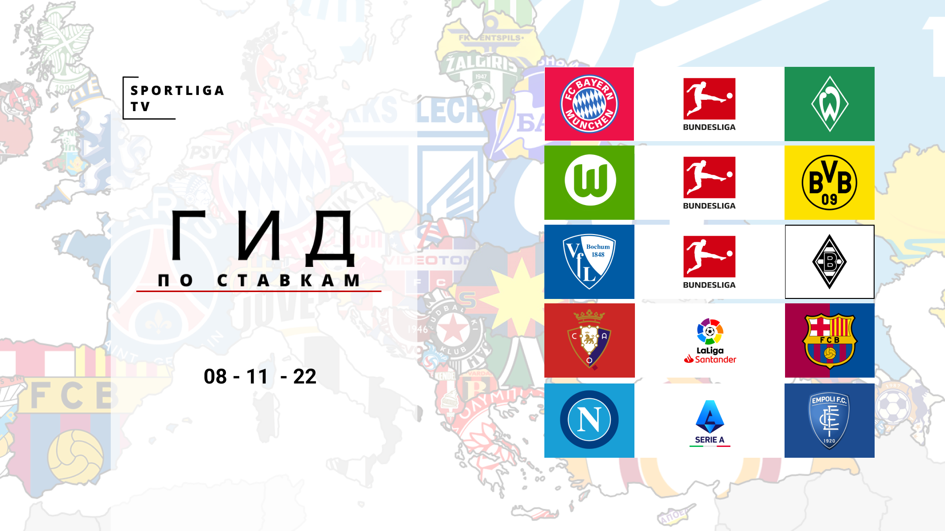 Сегодня очень интересные и неожиданные для анализа матчи, поэтому будет очень интересно! Как обычно мы дадим свои прогнозы и поговорим о всяком интересном, что связано с обсуждаемыми матчамиВ матче Барселоны узнаем, что за команда Осасуна и доставит ли она хлопот Барселоне? Поразмышляем на что способен Наполи без Хвичи и на что способно Эмполи на выезде?Пройдем квиз, который расскажет нам о темной стороне Баварии и вспомним о былом величии Вердера!Восхитимся новым страйкером Боруссии Дортмунд и узнаем почему Бохум, как минимум не проиграет более сильной Боруссии из Менхенгладбаха!