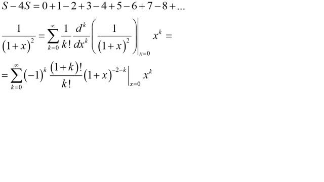 Рассмотрена сумма ряда натуральных чисел. Показано, как вычисляется сумма конечного ряда. Этот, уже бесконечный, ряд вычислен иным способом... со странным, но верным результатом.