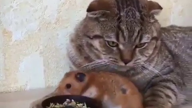 Кот и хомяк кушают из одной тарелки. #кошки #милота #хомяк