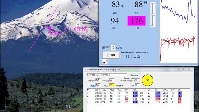 Запись отражает сеанс гипоксического фитнесса. Сеанс проводится с целью адаптации к гипоксической гипоксии посредством индивидуальной soft-управляемой тренировки... Сеанс начинается с высоты 2724м (концентрация кислорода 15%) , подъем осуществляется до высоты 4938м (11,5%), когда динамика адаптивной реактивности сердечно-сосудистой системы является основанием для "спуска". Эффективность тренировки (23мин)-13 сек (проба Штанге).Рекомендованная для последующих тренировок концентрация кислорода в дыхательной смеси-14%. Сеанс проходил под непрерывным контролем гемодинамики.