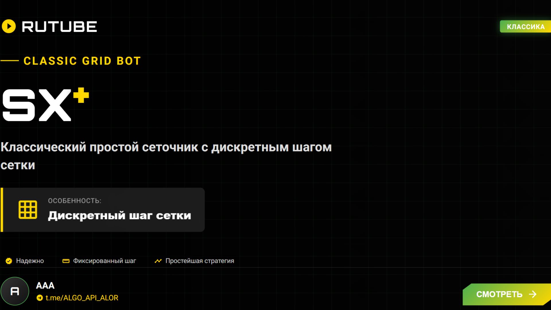 SX+: Классический сеточник с дискретным шагом — простой и надёжный алготрейдинг 📝 Описание: В этом видео представлен торговый робот SX+ — классический сеточник с дискретным шагом сетки для автоматической торговли на финансовых рынках. Простая и понятная логика работы делает этот инструмент идеальным выбором как для начинающих алготрейдеров, так и для профессионалов, ценящих надёжность и предсказуемость стратегии. 🔹 Ключевые особенности SX+: 🎯 Дискретный шаг сетки — чёткие уровни входа без «размытия» параметров; ⚙️ Простая настройка — минимальное количество параметров для быстрого старта; 🔄 Автоматическая работа — робот самостоятельно выставляет и переставляет ордера; 📊 Универсальность — подходит для акций, фьючерсов и криптовалют; 🔐 Надёжность — проверенная классическая логика без излишней сложности. 🔹 Что вы узнаете из видео: Принцип работы классической сеточной стратегии; Как настроить дискретный шаг под волатильность инструмента; Управление позицией: тейк-профит, стоп-лосс, фиксация прибыли; Практические примеры работы робота в разных рыночных условиях. 💡 Для кого это видео: Начинающие и опытные трейдеры, пользователи терминалов QUIK/Alor, сторонники консервативных стратегий и все, кто ищет простой и эффективный инструмент для автоматизации торговли. 🔗 Полезные ссылки: • Официальный телеграм-канал: https://t.me/ALGO_API_ALOR • Поддержка и документация: https://t.me/ALGO_API_ALOR ⚠️ Дисклеймер: Видео носит исключительно информационный и образовательный характер. Не является индивидуальной инвестиционной рекомендацией. Торговля на финансовых рынках сопряжена с риском потери капитала. Проводите собственное исследование и тестируйте стратегии на демо-счёте перед использованием реальных средств. #алготрейдинг #сеточнаястратегия #торговыйробот #SXplus #автоматизацияторговли #трейдинг #биржа #алгоритмическаяторговля #сеткаордеров #дискретныйшаг #финансовыерынки #роботтрейдер #классическаястратегия #QUIK #ALGOAPIALOR