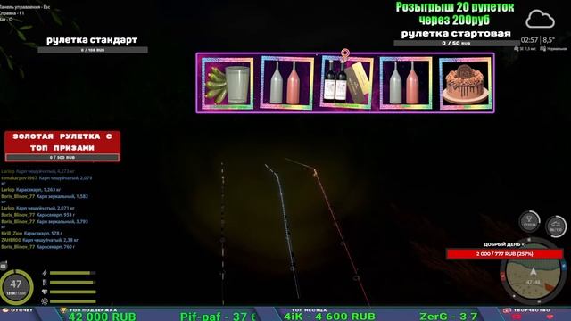 Поддержка донатом https://new.donatepay.ru/@1032463 Альтернативный донат https://www.donationalerts.com/r/kalyamba11 5536913964533059 карта Тинькоф Если стрим лагает,смотри стрим на трово https://trovo.live/s/Kalyamba_na_Ribalke Мой ВК - https://vk.com/kalyantv НИК в игре kalyan11 НАШ ДИСКОРД СЕРВЕР https://discord.gg/pFsEn9e9 Заказ водоема на 1 час - 500р ( весь стрим 2500р ) Модерка на канале 1200р ( каждая следующая на 100р больше) Озвучка доната на 40р,50р,100р,200р,300р,500р,1000р ✅Призы в рулетке "ЗОЛОТАЯ" ✔ ЗОЛОТО ✔ ПРЕМ ✔ КАТУШКИ ЮБИЛЕЙНАЯ БОРЕЛИКА, ВЕНГИ, ТАЙГА, СИЛЬВЕР 80, И другие ✔ ПАЛКИ ПИЛКЕРНАЯ, ДОНКА МОРСКИЕ, ✔ РОД ПОД, СТУЛЬЯ ✅Призы в рулетке СТАНДАРТ : ✔ катушкИ ЮБИЛЕЙНАЯ БОРЕЛИКА, ВЕНГИ, ТАЙГА, СИЛЬВЕР 80, И другие ✔ катушки 60 для медного ( ЭВИИ, НАТОРЫ, ГОЛДА, и тд) ✔ ПИЛКЕРНОЕ УДИЛИЩЕ КОРОЛЕВА ОКЕАНА ✔ Морское Донное удилище ✔ прем ( 3, 7, 30 дней) ✔ золото ( 1, 3, 5, 10, 20 ,50) ✔ билет на море ( 1, 3, 5 дней) ✔ голд наживка и др. ✅Призы в рулетке "СТАРТОВАЯ" ✔ катушка "silver80" ✔ катушка "БЕЛЫЙ КАЛИБР" ✔ катушка "Черный калибр" ✔ катушка "Протон" ✔ катушка "Нарга 6000" ✔ Набор Фидерист и спинингист ✔ Карповик Фортуна ✔ фидерные удилища ✔ прем, золото, алкашка, наживки и тд P.s Рулетка это не казино, а награда за поддержку стримера. Вечный ТОП ПОДДЕРЖКИ (11.05.2024) 1. Dimon_pokemonchik 119 784 2. Interceptor 75 508 3. Skreb79 71 261 4. une personne 68 619 5. Нарвал77 31 550