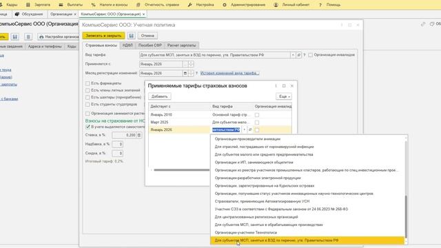 Видео о том, как в 1С ЗУП 8 (ред.3) с 2026 г. установить пониженный тариф по страховым взносам для субъектов МСП, основной вид деятельности которых указан в ЕГРЮЛ (ЕГРИП) и поименован в Перечне, утв. распоряжением Правительства России от 27.12.2025 № 4125-р и выполняется условие, что доля дохода от основного вида деятельности по итогам отчетного периода (квартал) составляет 70 % и более.