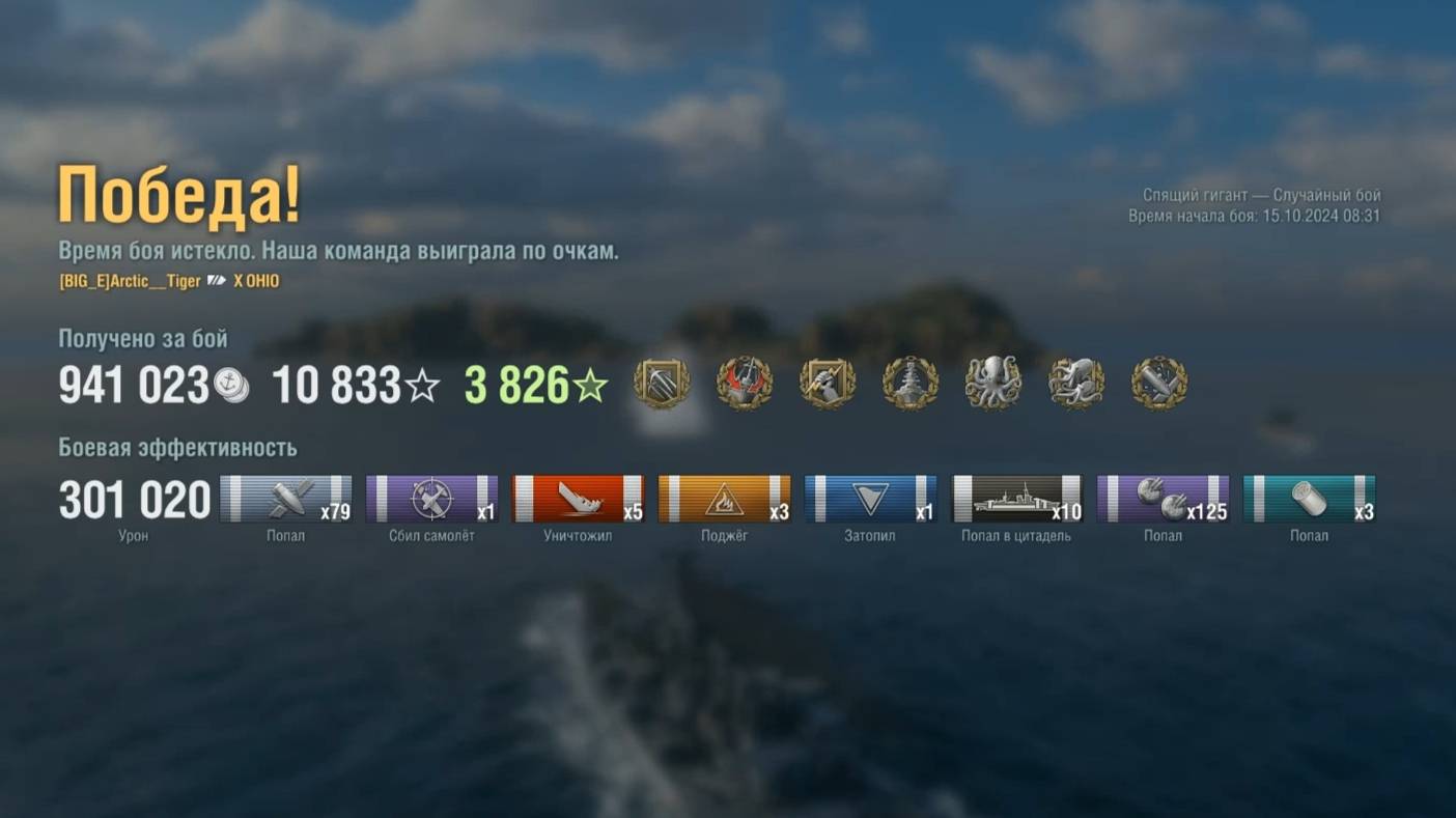 Линкор Ohio Игрок: Arctic__Tiger (NA) Карта: Спящий гигант - Случайный бой Урон: 301к Ohio - Линкор США 10 уровня