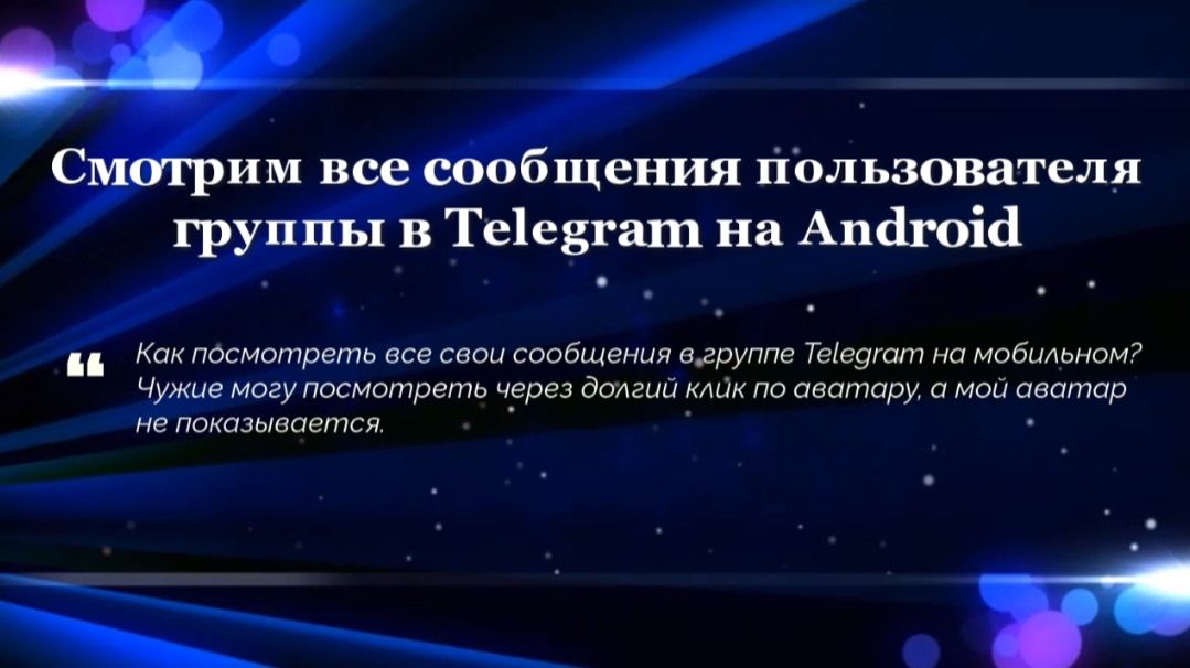 «Как посмотреть все свои сообщения в группе Telegram на мобильном? Чужие могу посмотреть через долгий клик по аватару, а мой аватар не показывается.» 🗣 Ответ на вопрос Посмотреть все свои сообщения в группе можно через поиск сообщений внутри группы в Telegram. 1. Заходим в группу и жмём три точки в правом верхнем углу для активации поиска в группе. 2. Далее жмём на иконку «человечка с лупой» в левом нижнем углу. 3. Открывается список пользователей, чьи сообщения можно посмотреть в группе. 4. Выбираем нужного пользователя для просмотра его сообщений в группе. 5. Жмём на ссылку «Списком» в правом нижнем углу для просмотра всех сообщений в виде списка. Для просмотра всех сообщений других пользователей группы в Telegram можно долгим нажатием по аватару пользователя открыть меню и выбрать «Найти сообщения». P. S. Смотрим на ПК все сообщения пользователя в группе: https://t.me/Addinfo/985 Дополнительно: • Источник: книга "100 советов пользователю Telegram" https://Addinfo.t.me #Вопросы #Ответы #Android #Поиск #Группы #Telegram