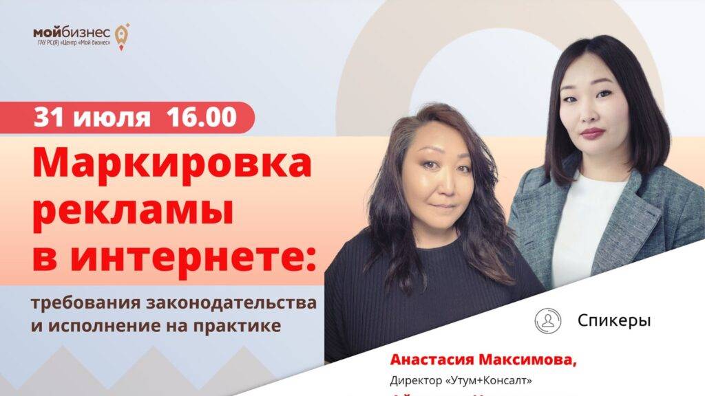 Закон о маркировке рекламы касается всех: от фрилансеров до крупных рекламодателей. А штрафы за отсутствие маркировки внушительные. На семинаре вы узнаете юридические особенности маркировки интернет-рекламы, требование и практический опыт исполнителей. Вы узнаете: 1. Юридические особенности маркировки рекламы в интернете; 2. Какая реклама должна маркироваться; 3. Об участниках процесса маркировки; 4. Как маркировать рекламу? 5. Актуальный практический опыт маркировки. Спикеры: Анастасия Максимова, директор «Утум+Консалт»; Айталина Ноговицына, директор по развитию и совладелец сайта yakutskgo.ru, маркетолог, специалист по стратегическому развитию компаний.