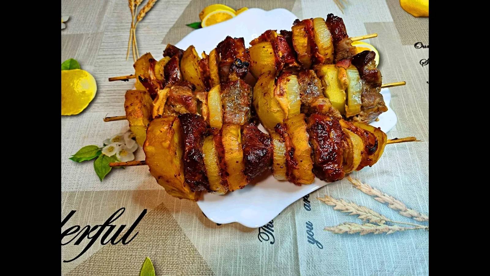 ПОЧЕМУ Я НЕ ГОТОВИЛА ЭТО РАНЬШЕ??? ОЧЕНЬ ВКУСНОЕ БЛЮДО КАК НА ПРАЗДНИК, ТАК И НА УЖИН. Потребуется : Свинина 1 кг. Режу на кусочки (толщиной 1 см). Я накрываю мясо пищевой пленкой и с помощью кухонного молотка сбиваю его с обеих сторон. Солим и перчим с обеих сторон по вкусу. Нарежьте 4 картофелины ломтиками. соль 1 ч. л. Черный молотый перец 0,5 ч. л. Паприка 0,5 ч. л. растительное масло 2 ст. л. Хорошо перемешать. Лук репчатый 2 шт. Режу лук кольцами. На шпажки поочередно насадить картофель, мясо, лук, бекон. Поверх фольги я положила влажную пергаментную бумагу. Выкладываю мясо на фольгу и плотно ее запечатываю. соевый соус 2 ст. л. кетчуп 1 ст. л. мед 1 ч. л. Французская горчица 1 ч. л. Хорошо перемешать. Мясо смазываю соусом. Ставлю мясо в духовку еще на 20 - 30 минут (до румяной корочки). Вынимаю мясо из духовки. Все готово! Приятного аппетита! Хорошего дня и хорошего настроения!